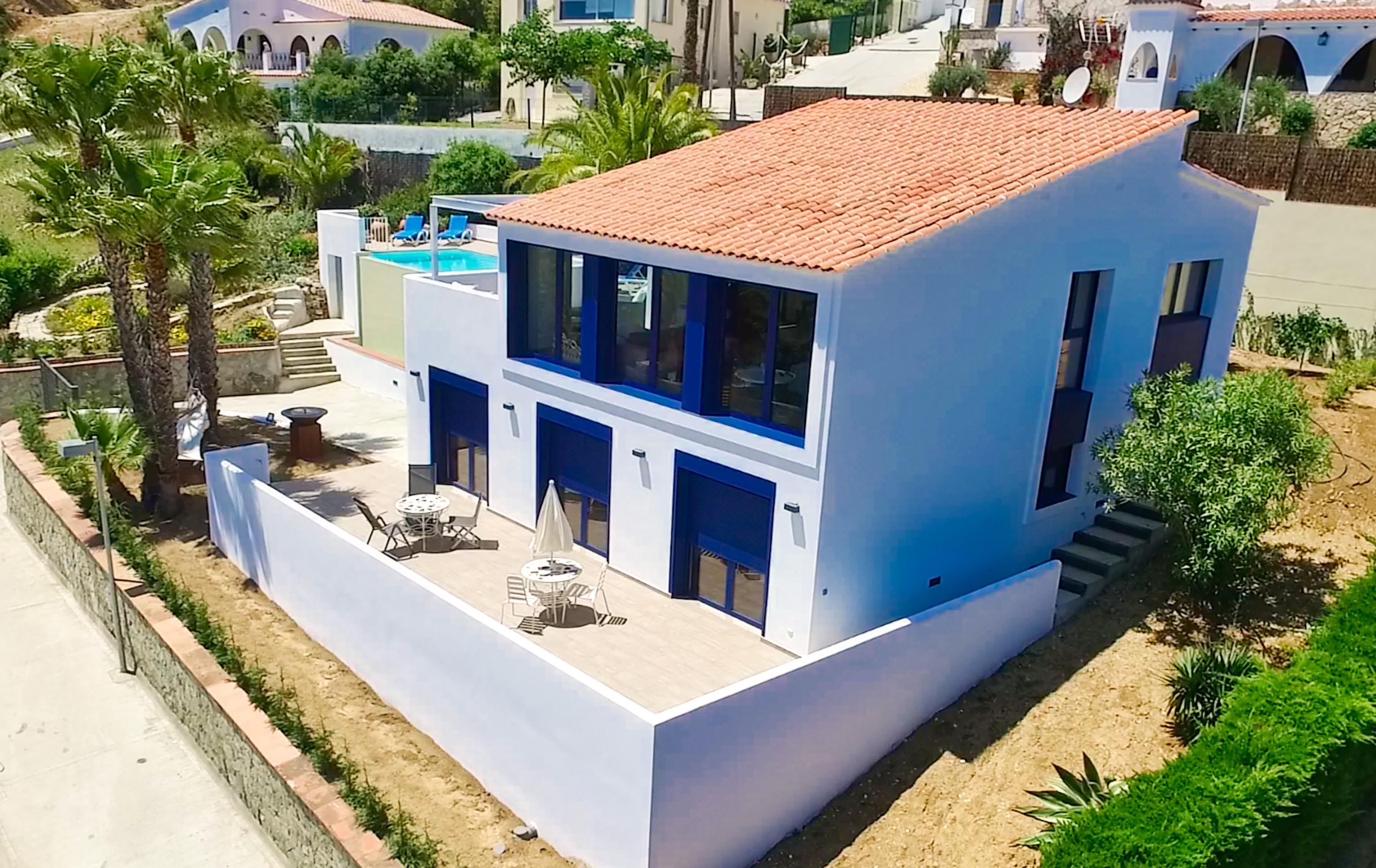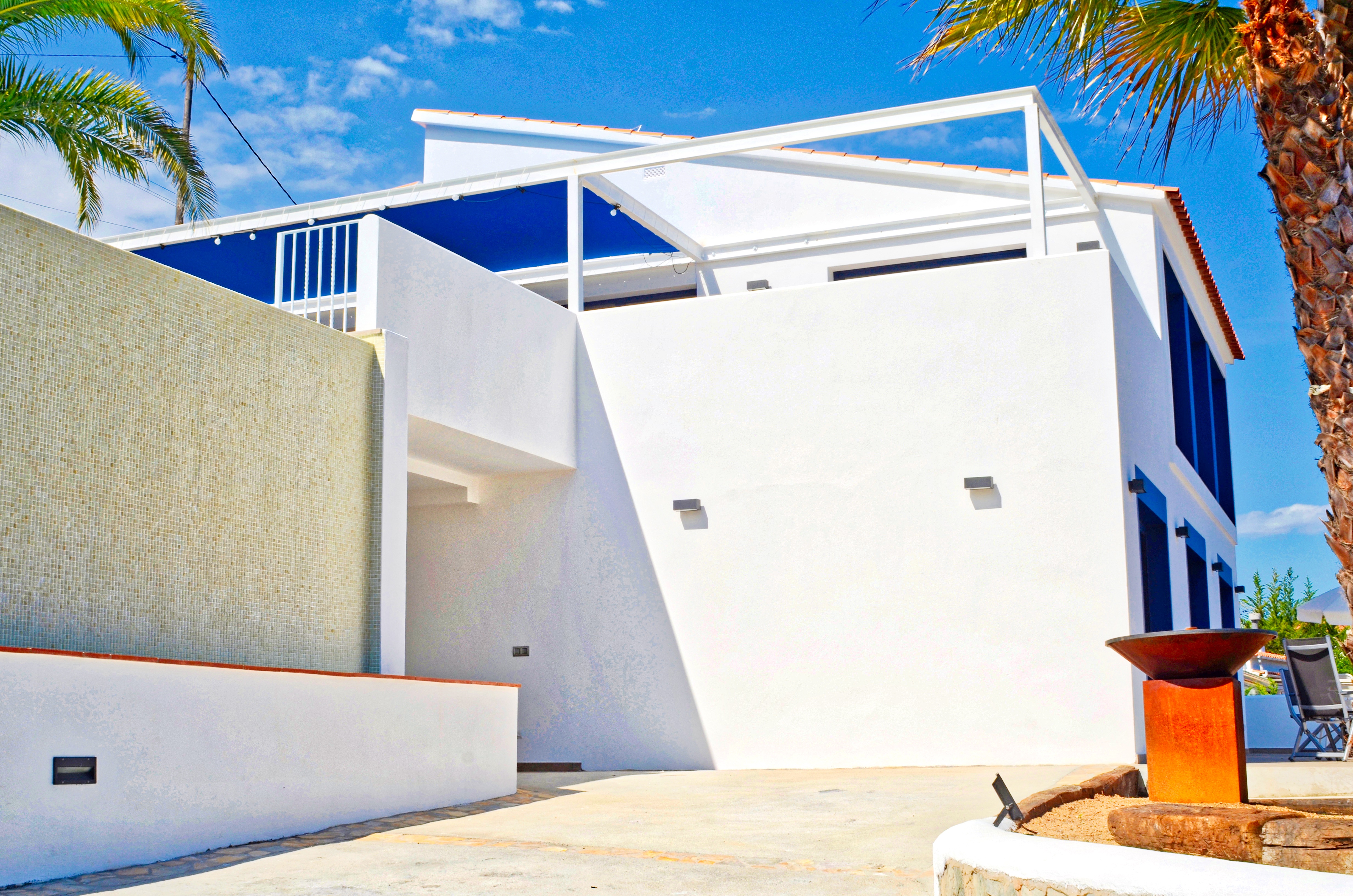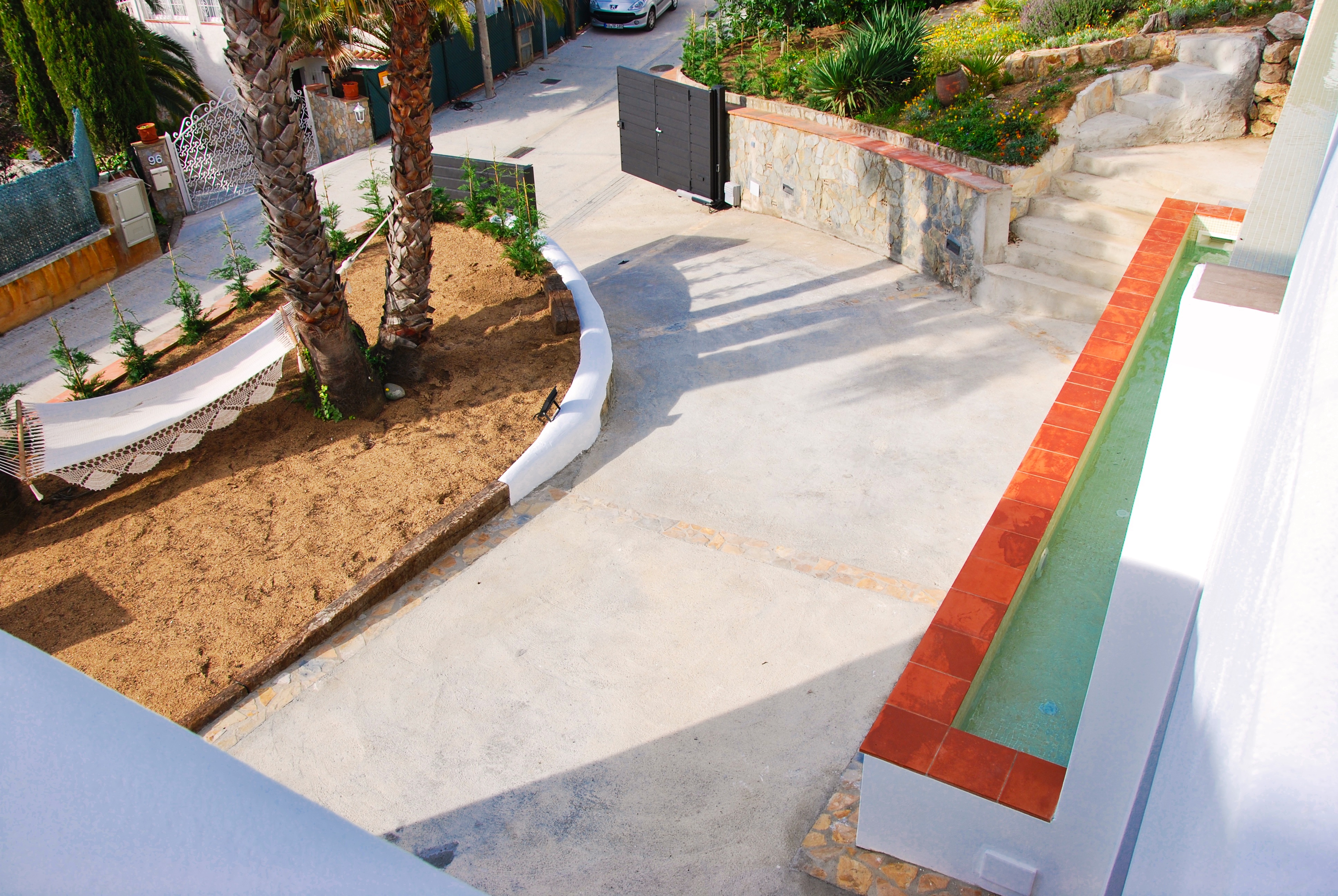 The villa features ample garden and terrace spaces all around. while the upper level terraces compliment the pool and the daily action, the lower terrace is provides a more quiet space that is accessible from the entrance as well as directly from the bedrooms. The towering entrance palmtrees are the perfect place for a hammock and one can rest there to read a book in the shade or just enjoy the gentle breeze. The inner driveway allows parking for one car but there is more space in the street for parking without parking restrictions. The villa features a natural garden with a patch of cirtus trees, various palm trees, a fig treem, an olive tree and a hedge of cypresses which caters for additional privacy in the quite neighborhood.
