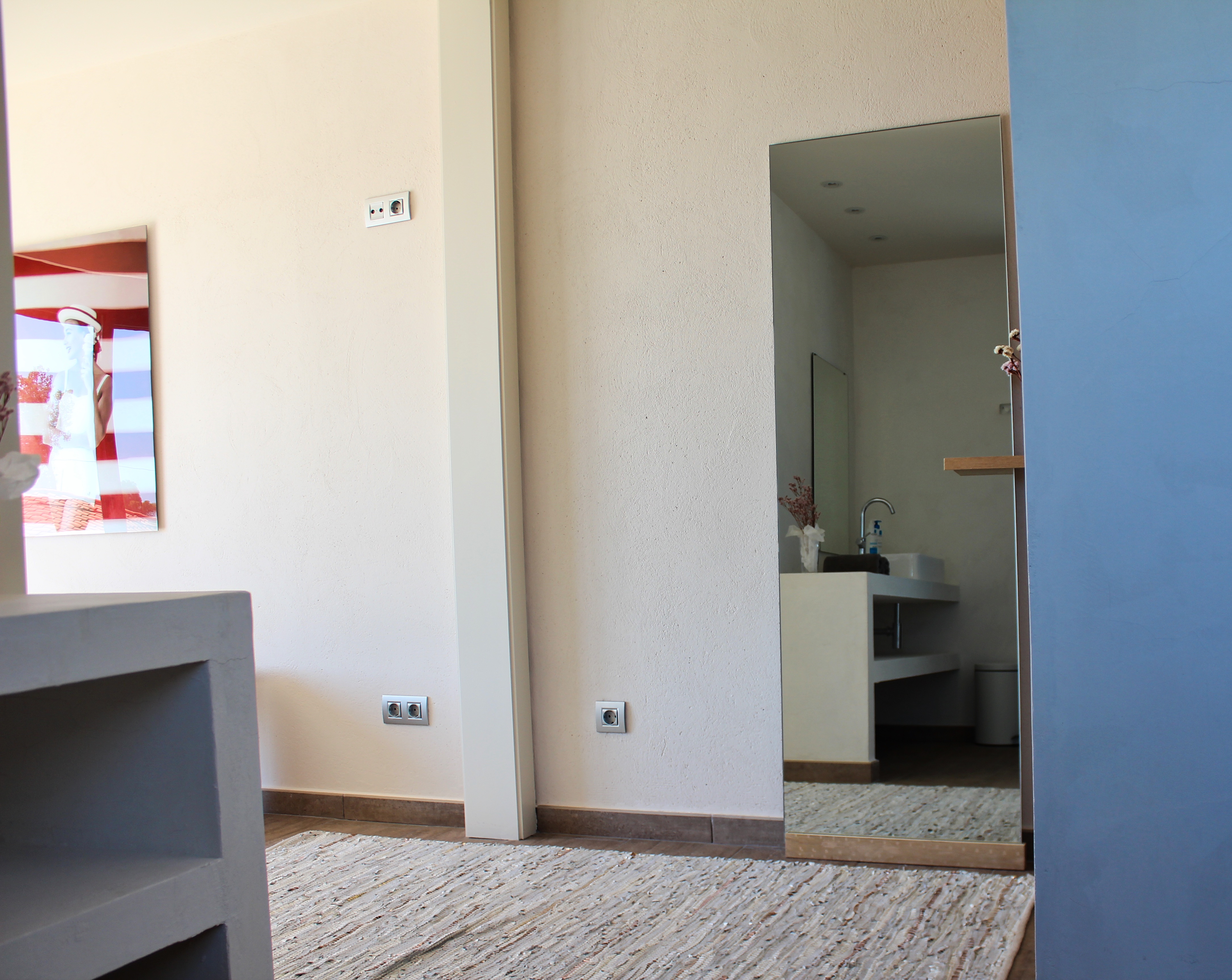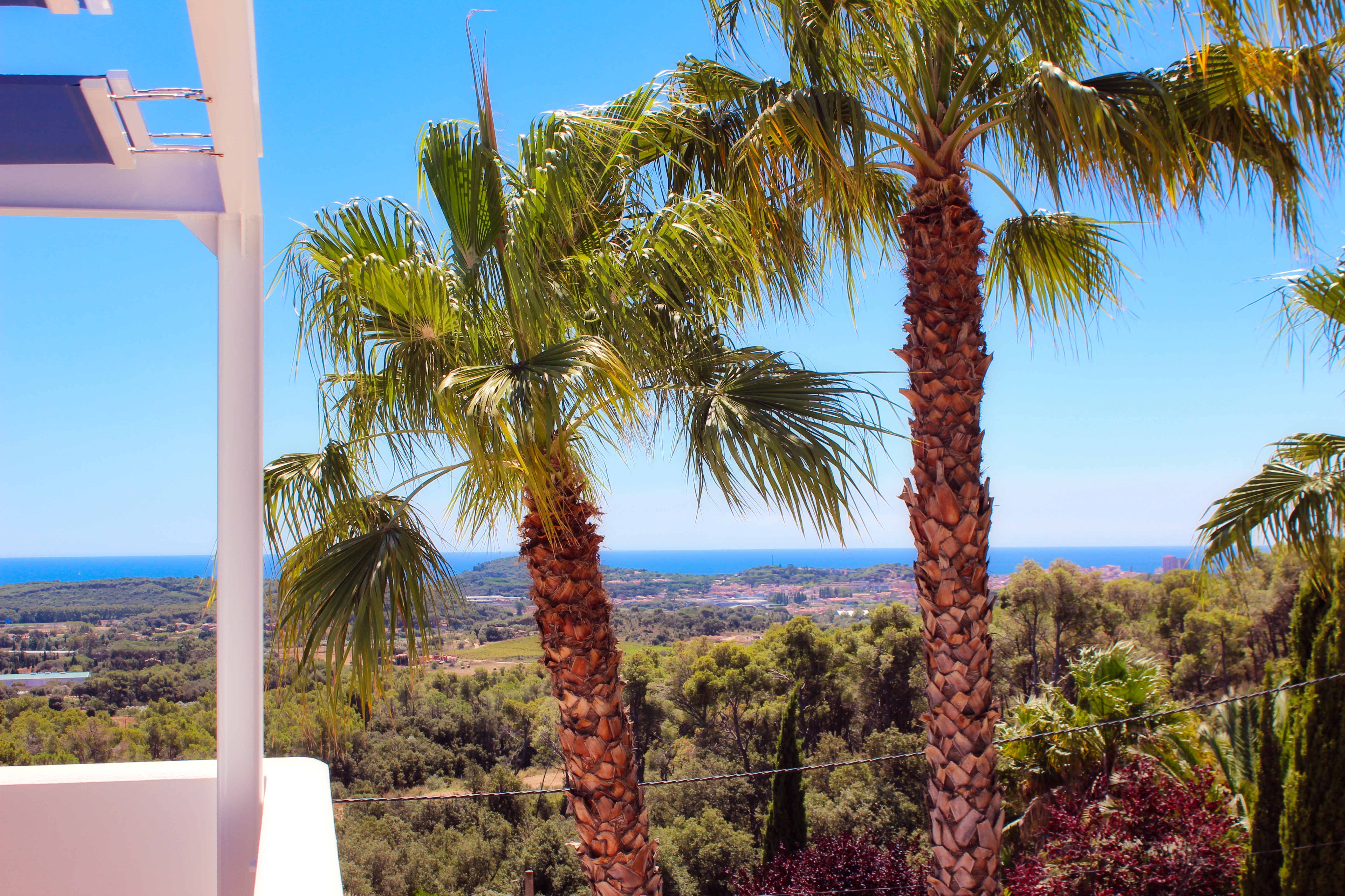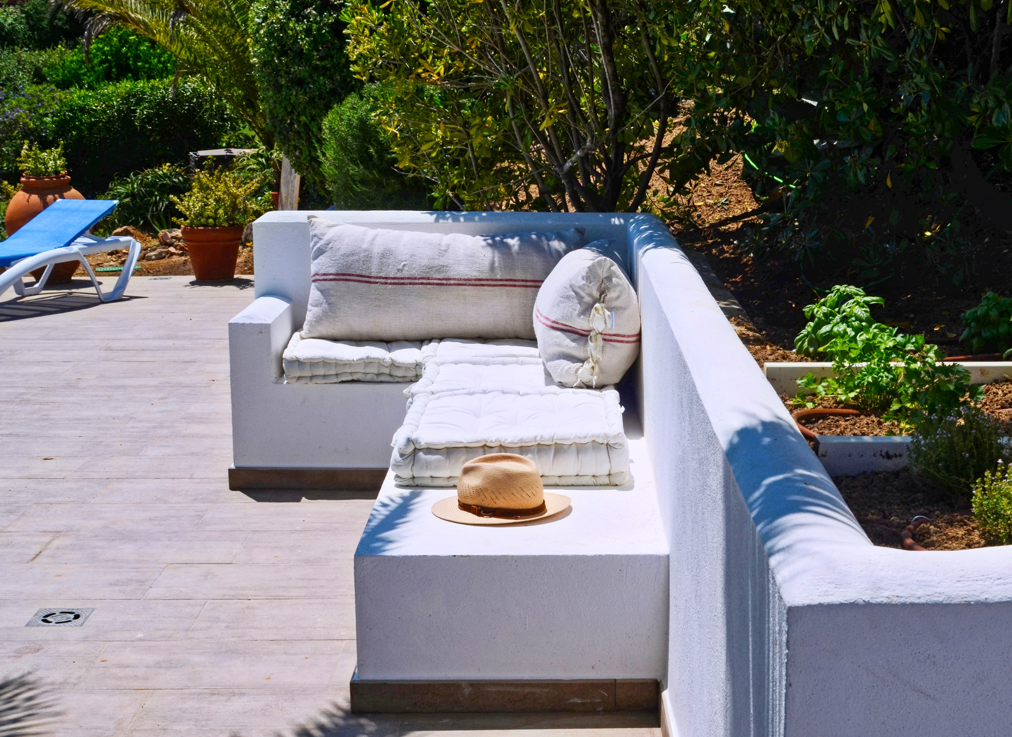 The villa features ample garden and terrace spaces all around. while the upper level terraces compliment the pool and the daily action, the lower terrace is provides a more quiet space that is accessible from the entrance as well as directly from the bedrooms. The towering entrance palmtrees are the perfect place for a hammock and one can rest there to read a book in the shade or just enjoy the gentle breeze. The inner driveway allows parking for one car but there is more space in the street for parking without parking restrictions. The villa features a natural garden with a patch of cirtus trees, various palm trees, a fig treem, an olive tree and a hedge of cypresses which caters for additional privacy in the quite neighborhood.