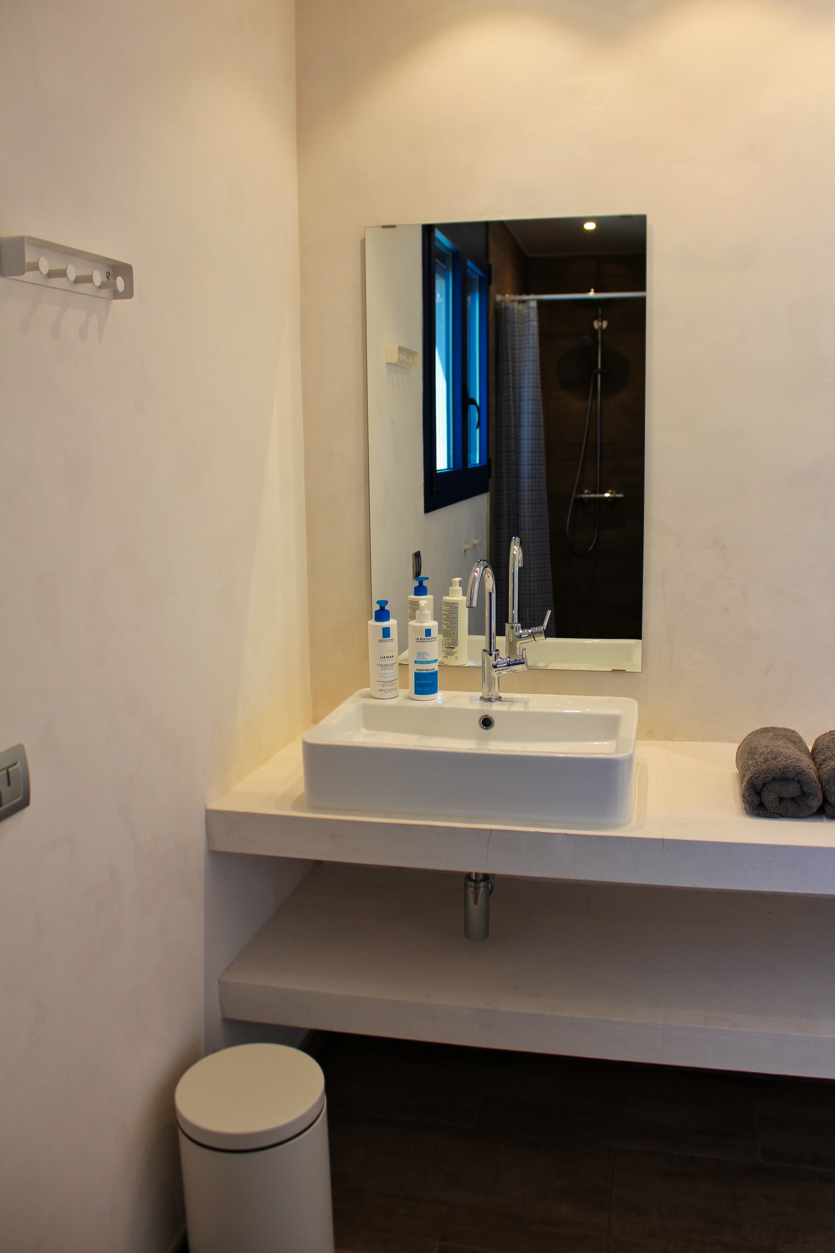 At the [manuki mas] the private and sleeping quarters are intentionally separated from the "action" to provide room for retreat and relaxation. Located on the lower level, all three bedrooms feature an en-suite bathroom with toilet, sink and shower as well as double beds. Through the glass doors one can enjoy the unobstructed views to the sea straight out of bed and access the lower terrace. Electric metal shutters cater for a good night's sleep and enhanced security. Additionally, the large entrance hall and patio add to a mondane appeal of the villa and provides additional storage space for groceries, beach toys etc.